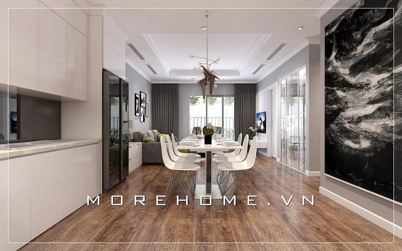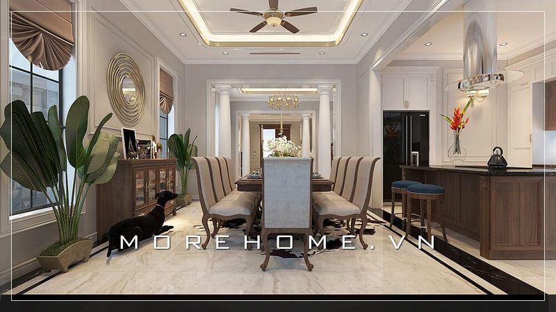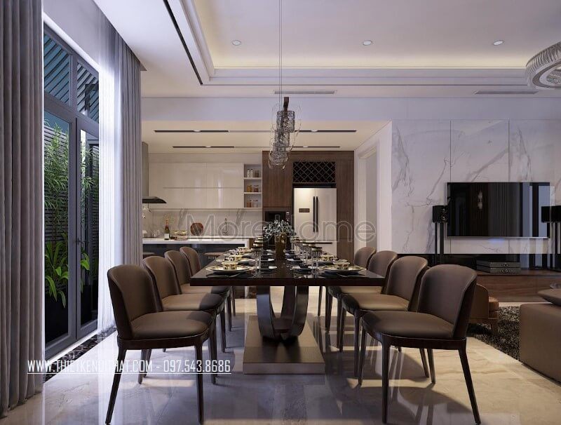 Bàn ăn thiết kế vừa phải gia chủ tránh được cảm giác xa cách trống trải mà vẫn rất gần gũi vơi nhau, bàn tiệc lúc nào cũng tràn ngập sự ấm cúng