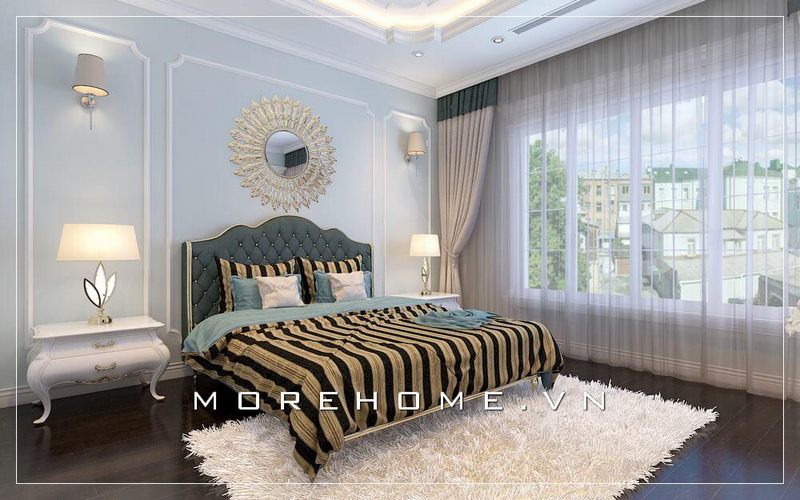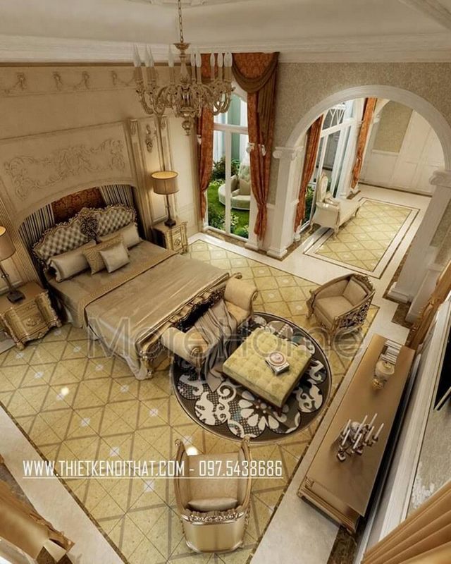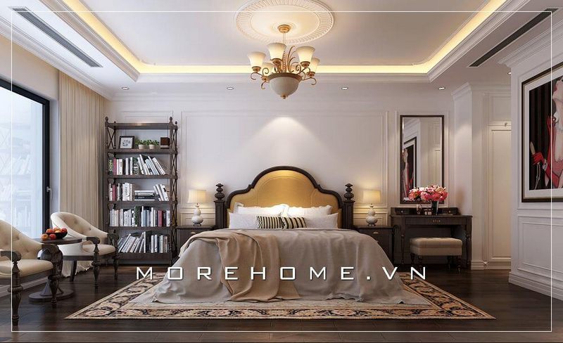 Phòng ngủ được thiết kế theo tông màu ấm cùng nội thất tân cổ điển sang trọng, đẳng cấp