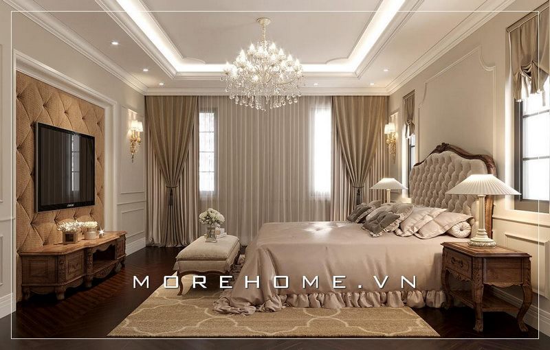 Phòng ngủ được thiết kế rộng, sang trọng với nội thất gỗ tự nhiên tân cổ điển tạo nên không gian quý phái và đẳng cấp