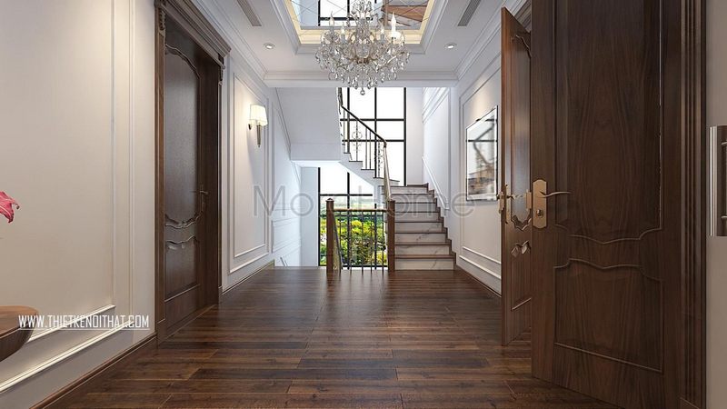Kệ tivi cổ điển từ gỗ tự nhiên được sử dụng trong phòng khách biệt thự Imperia Hải Phòng.