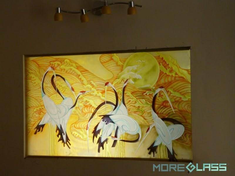 Mẫu tranh điêu khắc chim hạc phong cách Nhật Bản trên chất liệu kính cường lực được tạo ra với mong muốn giúp gia chủ có được sự bình yên và hạnh phúc.