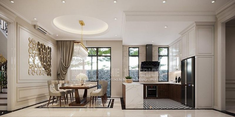 Đảo bếp mặt đá trắng vân mây mang đến sự tiện nghi và sang trọng.