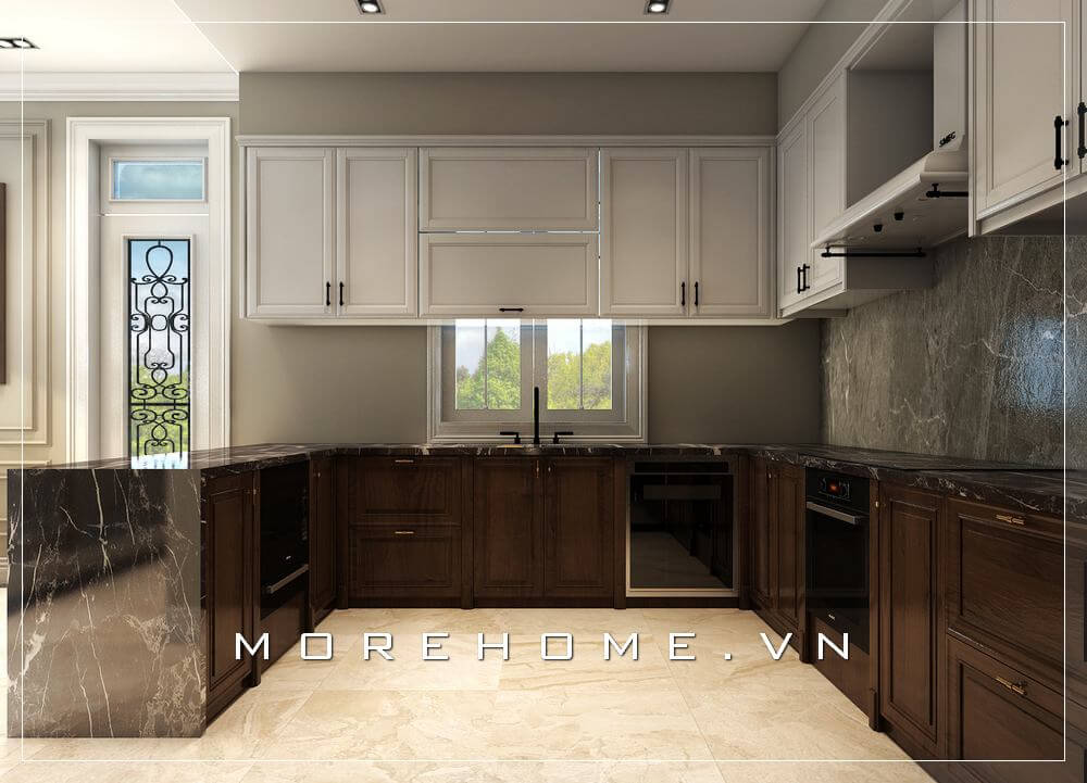 Mẫu tủ bếp gỗ tự nhiên màu trắng tân cổ điển, mặt tủ bếp ốp đá màu nâu vàng cao cấp thể hiện không gian nấu nướng sạch sẽ, thoáng mái và đẳng cấp
